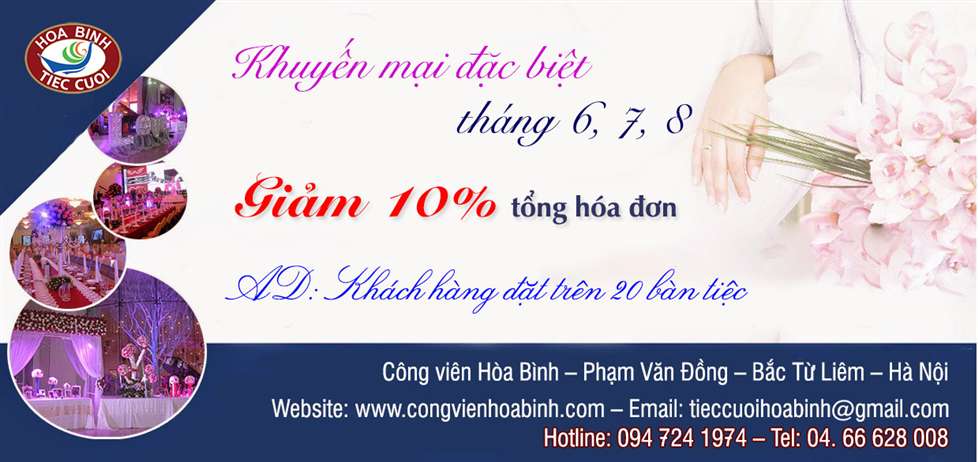 | Chương trình khuyến mại đặc biệt trong tháng 6.7.8/2016 Giảm 10% cho tổng hóa đơn đặt cỗ, tiệc tại Nhà hàng tiệc cưới Hòa Bình  |